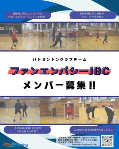 2025年4月から活動している「ファンエンパシーJBC」(ジュニアバドミントンクラブ)のメンバーを募集しております。 現在は武生第三中学校を拠点として日々練習に励んでいます!対象は小学生・中学生です。 まだまだ新しいチー […]